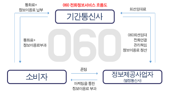 핸드폰과 집전화를 사용해 060전화 사용자들과 자유롭게 대화를 나눌 수 있는 서비스입니다. 해당 서비스 이용 시 정보이용료와 부가세가 별도로 부과되며 일반적으로 알고 있는 060 전화 대화 서비스가 이에 해 당합니다.