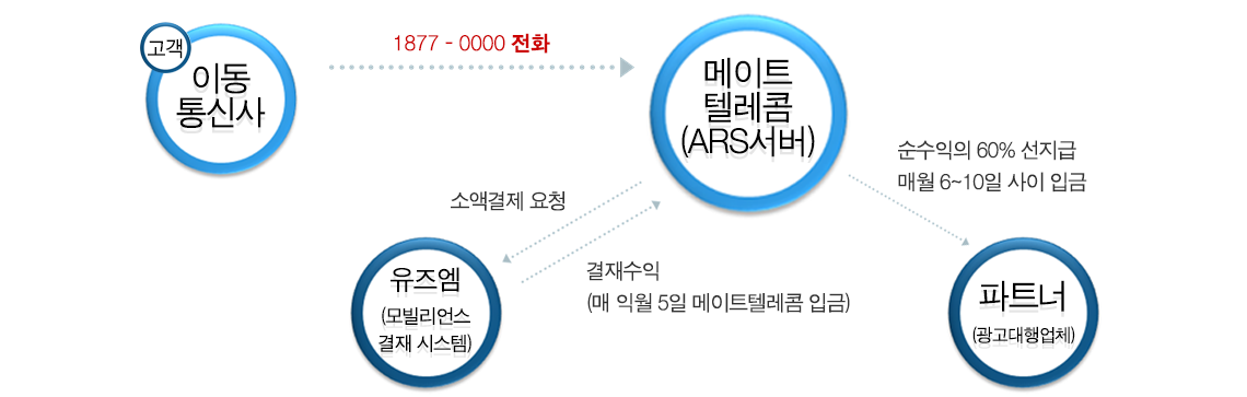 메이트텔레콤과 소액결제서비스 사업자 계약 진행을 통해 사업을 진행하실 수 있습니다. 매월 매출액의 77%가 당사로 입금되며 입금된 금액의 60%를 익월 10일 선지급하고 있습니다. 060 전화정보 서비스와 마 찬가지로 부여된 전화번호를 온/오프라인 상에 별도 홍보하여 수익을 발생 시킬 수 있습니다. 자세한 수익 구조는 사업 문의를 통해 해주시면 됩니다.